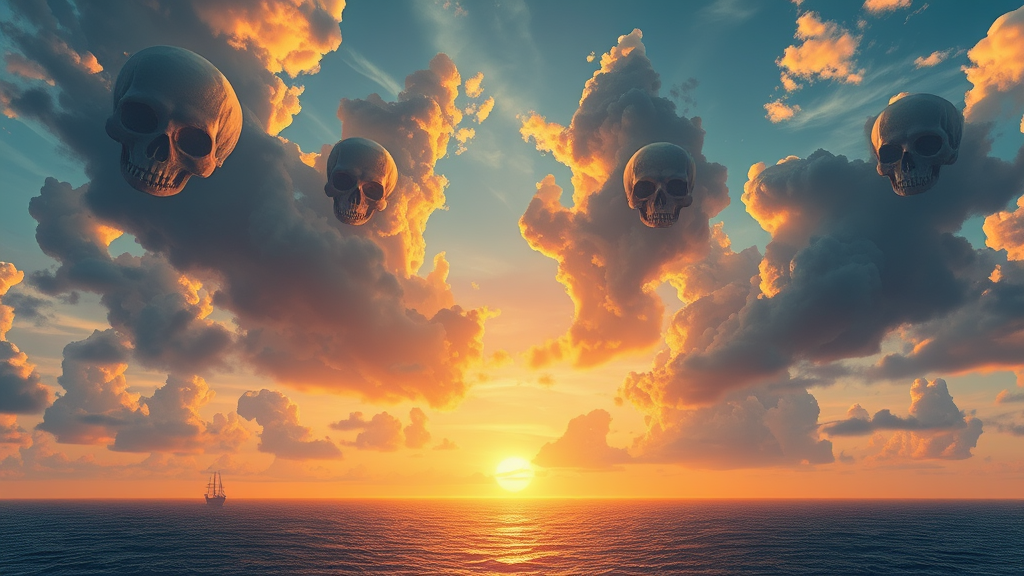 A breathtaking fusion of realism and fantasy unfurls in the sky, where ethereal clouds intermingle with intricate skull motifs, casting a surreal elegance over a light-filled seascape. The horizon brims with vibrant hues as the golden sun dips below, illuminating the water like liquid light. This dreamlike scene, reminiscent of transavanguardia art, invites travelers on an extraordinary journey. The detailed textures evoke the craftsmanship of ZBrush, blending the fantastical with the real in a vision so stunning it's nearly beyond belief.