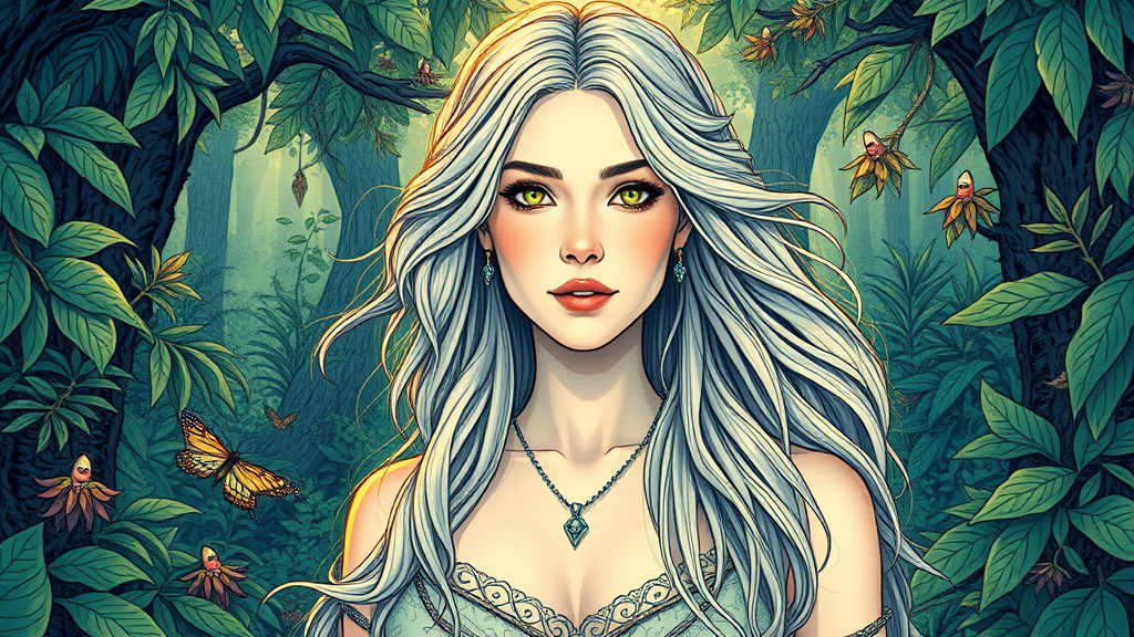 A breathtaking, highly detailed depiction of a female druid deep within a lush, vibrant forest. She stands at the center of the scene, radiating an aura of natural beauty and wisdom. The lineart is precise and intricate, capturing every delicate feature and detail of her serene expression and flowing hair. Her skin glows with a sense of ethereal elegance, accentuated by a simple necklace that rests gently around her neck. Inspired by the cinematic artistry of Carne Griffiths and the emotive style of Conrad Roset, the scene weaves together elements of nature and spirit in a harmonious composition. The rich palette of colors enhances the intricate details, creating a comprehensive and captivating visual experience that speaks to the soul and ignites the imagination.