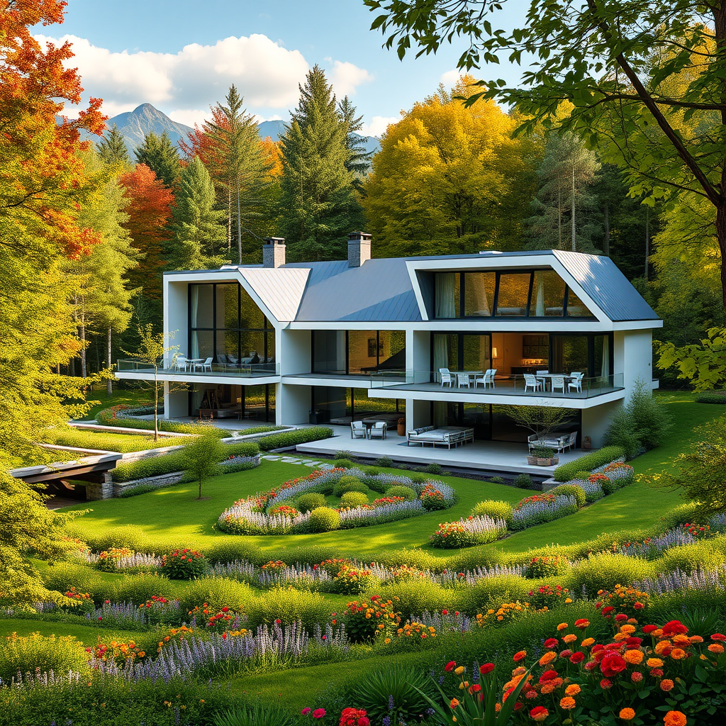 A breathtaking house embodying Scandinavian modernism nestled within a lush forest, surrounded by vibrant trees and an abundance of greenery, offering a mesmerizing view of distant mountains. This architectural marvel boasts a sprawling garden filled with an array of colorful flowers, blending effortlessly with the natural landscape. Designed with ultra-realistic precision in 4K, the home features sleek, clean lines and expansive glass windows that invite the beauty of nature inside. Its seamless integration of indoor and outdoor spaces creates a harmonious balance between modern design and the serene wilderness.