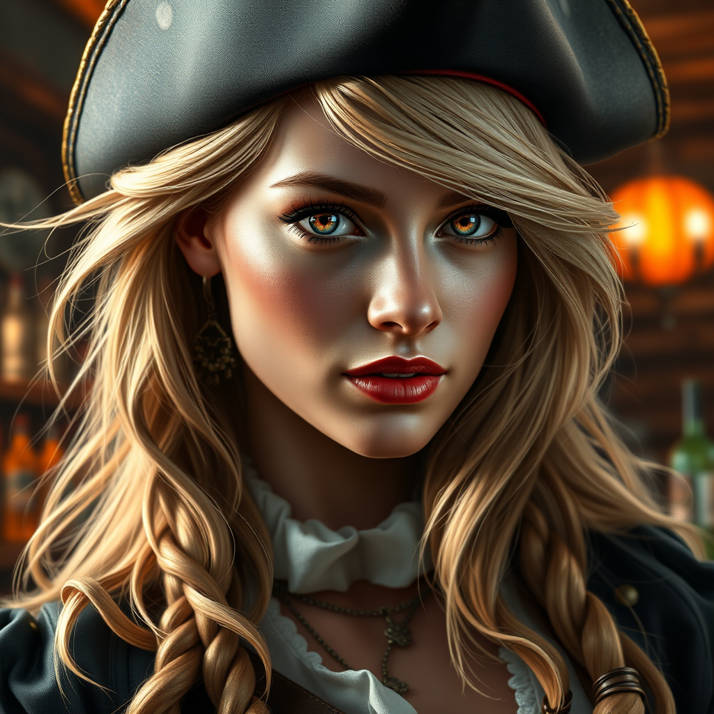 A breathtaking hyper-realistic digital painting of a stunning blonde 20-year-old woman in pirate captain attire, showcasing her full character in intricate detail. Her face is flawlessly rendered with detailed features, set in a masterpiece of luminism and bar lighting. Her hair, highlighted with random colors, flows gracefully, and her captivating eyes are a striking random color. The entire scene captures her perfect body and anatomy, enveloped in a gritty, realistic color scheme that enhances the bright and intense fantasy setting. This award-winning portrait, sharp in focus, combines high-resolution 16K quality with UHD and HDR clarity, demonstrating intricate details and intense coloration. The illustration is an unforgettable masterpiece, boasting perfect composition and dynamic presence.
