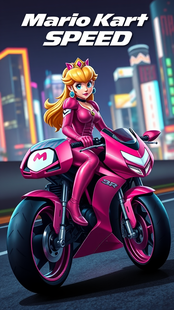 A breathtaking, hyper-realistic illustration of Princess Peach on a sleek pink Mario Kart-inspired racing bike, designed in a Fast and Furious aesthetic. She is dressed in a chic pink sports suit with white accents and holds a stylish matching helmet in her right hand. The backdrop showcases a vibrant nighttime cityscape illuminated by neon lights, adding a touch of dark fantasy to the scene. The phrase "Mario Kart SPEED" is prominently displayed at the top, enhancing the cinematic vibe. The high-resolution image, combined with striking typography, offers an unforgettable visual spectacle.