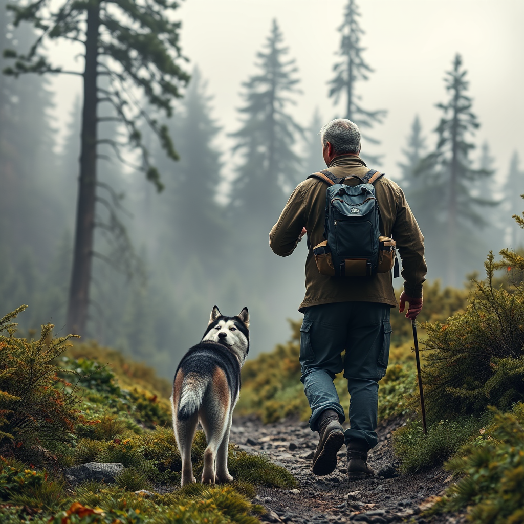 A breathtaking hyper-realistic image that captures the essence of adventure, depicting a middle-aged man with a sturdy average build and short, salt-and-pepper hair, walking alongside a vigilant Siberian husky. This captivating scene shows them traversing towards a vast and awe-inspiring Patagonian forest, their backs turned to the viewer. The man is clad in rugged exploration attire, meticulously detailed, as he treads on a naturally rugged path encased in vibrant greenery. Towering trees loom in the distance, shrouded in an ethereal diffused light that softens the overcast sky, casting a serene yet adventurous ambiance. The Husky, with its fur delicately lit by the gentle, natural light, appears alert and focused. This masterpiece encapsulates the untamed beauty of Patagonia—its pristine wilderness, dramatic landscapes, and the beckoning spirit of exploration. Every element, from the intricate textures of the clothing and dog fur to the lifelike portrayal of nature, is rendered with cinematic precision and realistic color tones, echoing the artistic brilliance reminiscent of Studio Ghibli and John William Turner.