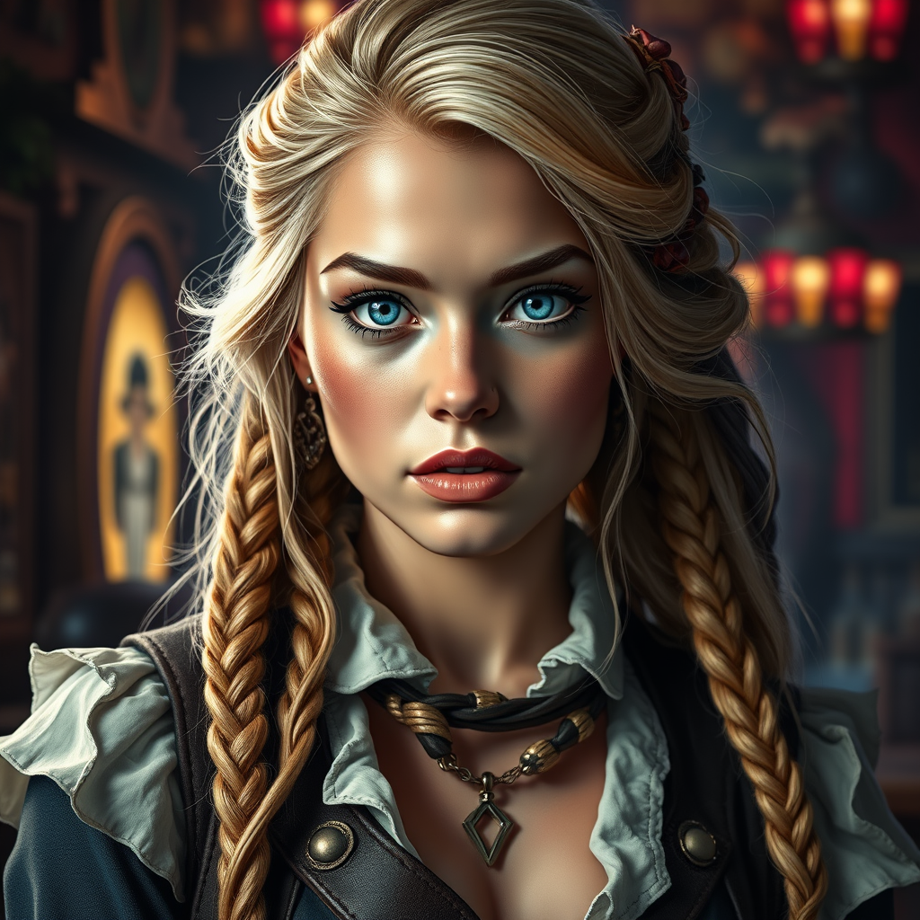 A breathtaking hyper-realistic portrait of a beautiful 20-year-old woman with striking blonde hair intertwined with random colors, wearing intricately detailed pirate captain attire. Her face is a masterpiece of detail, showcasing random color eyes that captivate with their intensity. The full-body view highlights her perfect anatomy, set against a backdrop of luminism and bar lighting that casts a gritty yet realistic color scheme. Her expression is both fierce and alluring, captured in an award-winning digital painting of 16K UHD quality. The scene is vibrant with intense coloration, blending elements of fantasy and realism. The hyper-detailed illustration boasts sharp focus and intricate details, rendering this cover-worthy masterpiece truly stunning.