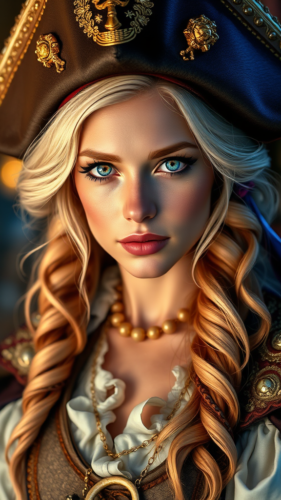 A breathtaking hyper-realistic portrait of a stunning blonde 20-year-old woman dressed in elaborate pirate captain attire. The image is a digital masterpiece capturing a full character in view with an intricately detailed face and stunning random colored hair. Her eyes, a striking random color, add to her captivating look. The portrait is a full-body composition, set against a background with bar lighting that emphasizes the luminism. The artwork features a complex design with hyper-detailed elements, showcasing a perfect body and anatomy. The colors are vibrant and gritty, with a realistic and intense color scheme that highlights the intricate details. Her beautifully detailed face and pretty eyes make the illustration award-winning, filled with fantasy elements. Captured in sharp focus, this 16K, UHD, HDR image showcases an awe-inspiring blend of bright coloration and realism in a cover-worthy painting.