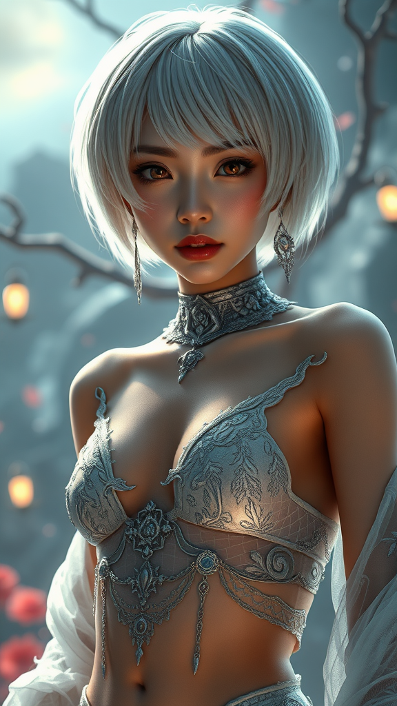 A breathtaking, hyperrealistic portrait of a beautiful young Asian girl with short white hair, exuding an ethereal presence as the queen of the dead. Her face is intricately detailed, capturing a sense of otherworldly allure. Her toned stomach and subtle midriff are gracefully revealed, adding to her regal poise. Set against a captivating fantasy background, the scene is enhanced by cinematic lighting that highlights her enchanting features. The environment is stunning and immersive, embodying a wide-angle perspective reminiscent of the collaborative artistry of Greg Rutkowski and Magali Villanueve. The image captures the essence of a flawlessly rendered three-dimensional creation, ensuring the portrayal is devoid of any anatomical inaccuracies or distortions.