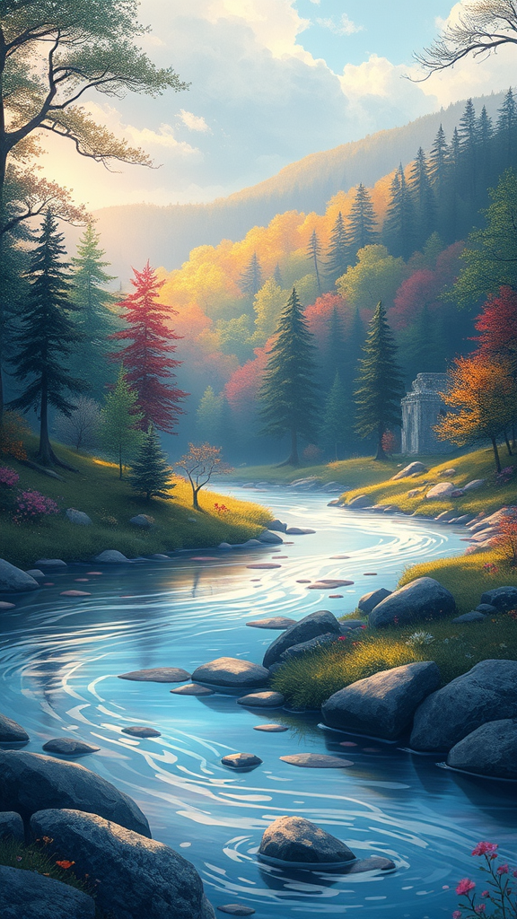 A breathtaking illustration captures a serene landscape that exudes tranquility and serenity, with a lush and vibrant forest in the background, painted in a spectrum of enchanting colors. A gently flowing river meanders gracefully in the foreground, its waters sparkling under the soft light. The scene is depicted in an ethereal fairy tale style, with whimsical elements subtly woven into the natural setting, giving it a touch of magical realism.