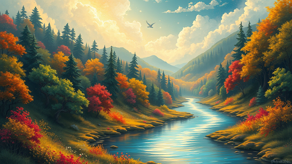 A breathtaking illustration, depicting a serene landscape that exudes tranquility and harmony. In the background, a vibrant and enchanting forest, lush and rich with hues of green, gold, and crimson, creating a mesmerizing mosaic of colors. In the foreground, a gentle river winds its way through the scene, its surface shimmering with reflections of the sky. The overall style is reminiscent of a fairy tale, blending whimsy and magic to transport the viewer to a world of peace and wonder.