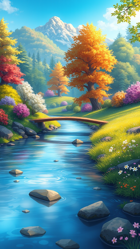 A breathtaking illustration depicts a tranquil landscape where serenity reigns supreme. In the foreground, a gentle river meanders, reflecting the vibrant hues of the lush, colorful forest that forms the backdrop. This enchanting scene, reminiscent of a fairy tale, is filled with softly blooming flowers and dappled sunlight filtering through the trees, casting a warm glow upon everything it touches. A small wooden bridge arches gracefully over the river, inviting one to cross into this magical, peaceful haven.