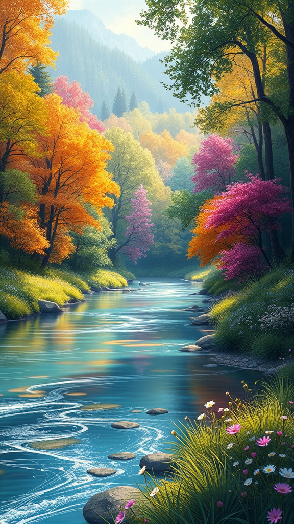 A breathtaking illustration of a tranquil landscape, where the vibrant, multicolored woods blend seamlessly into the serene background. In the foreground, a gently flowing river glistens under the soft light, its waters reflecting the myriad hues of the forest. The scene exudes fairy tale charm, with dappled sunlight filtering through the trees, casting playful shadows, and a gentle breeze rustling the leaves, creating an atmosphere of peace and calm. Delicate wildflowers pepper the riverbanks, adding splashes of color and enhancing the magical feel of this enchanting world.