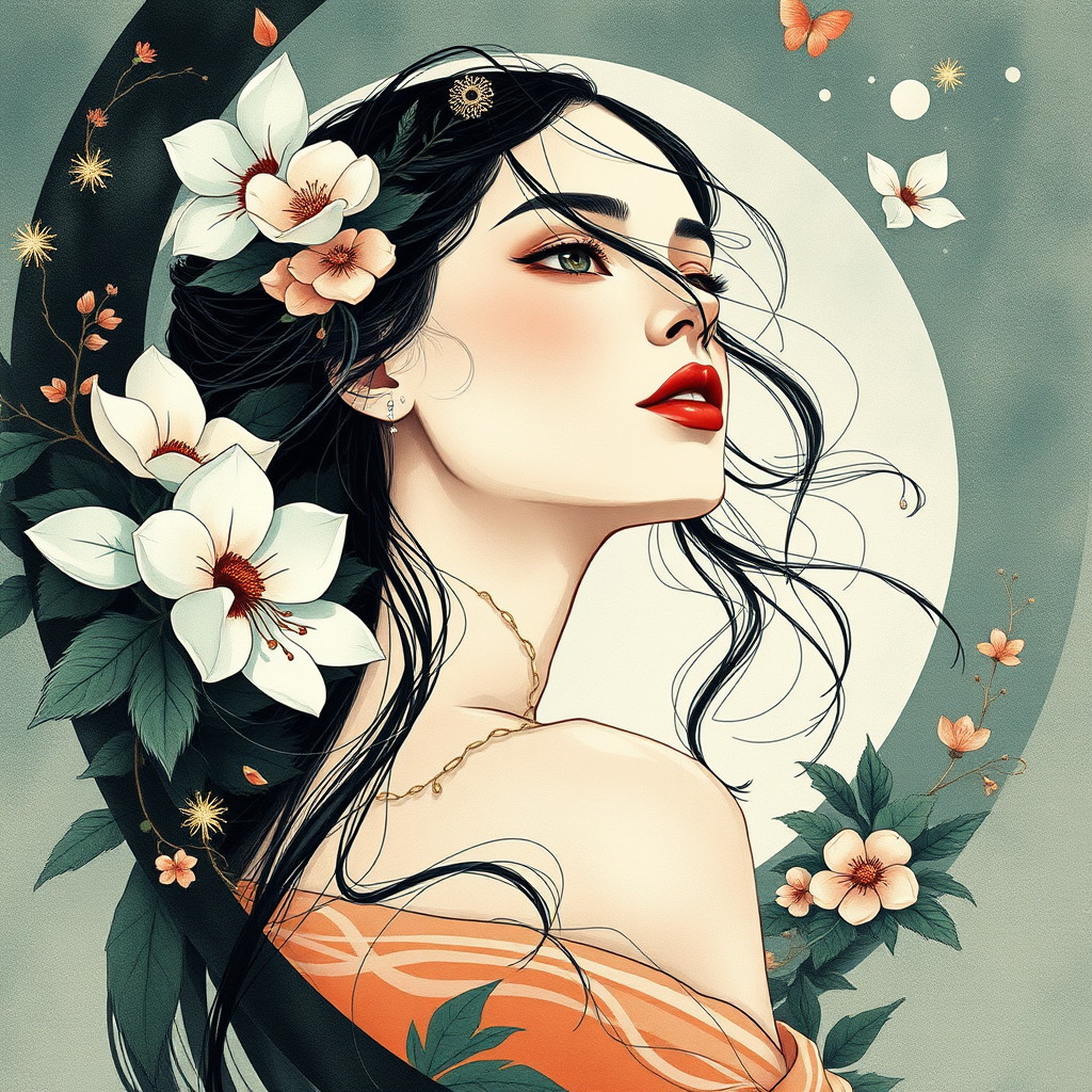 A breathtaking illustration of a woman, capturing the essence of flowing video montages, blended with nature-themed art nouveau elements. Featuring a soft-focus effect, the artwork evokes unparalleled beauty through minimalist sketches and elegant curves, showcasing free and expressive brushwork in a 73:128 aspect ratio, with a highly stylized approach.