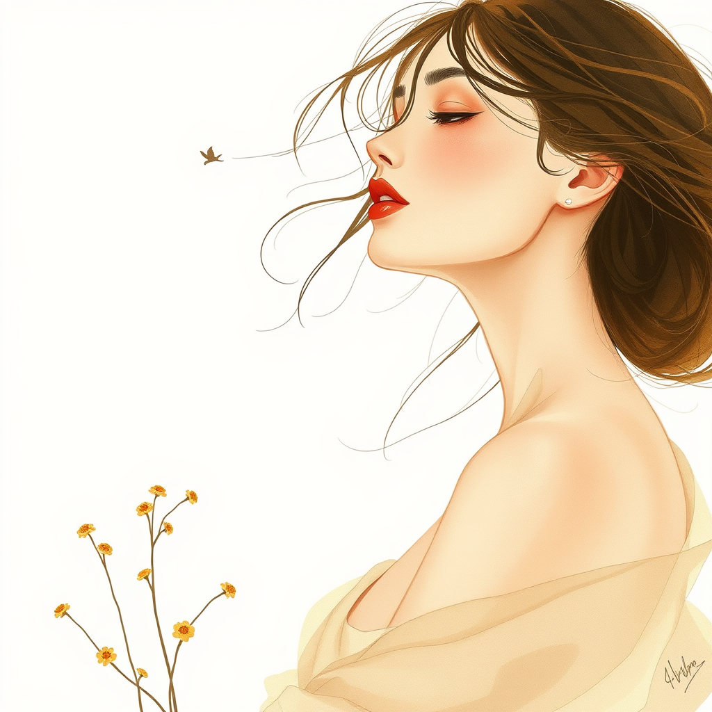A breathtaking illustration of a woman, inspired by the fluidity of video montages and the elegance of nature-themed art nouveau, featuring delicate, soft-focus details. The composition conveys a sense of awe-inspiring beauty through minimalist sketches, characterized by graceful curves and liberating brushwork, creating an ethereal and timeless quality. The artwork captures an elongated aspect ratio, enhancing the verticality of the form, while the elevated level of stylization highlights the interplay between the natural and the abstract.