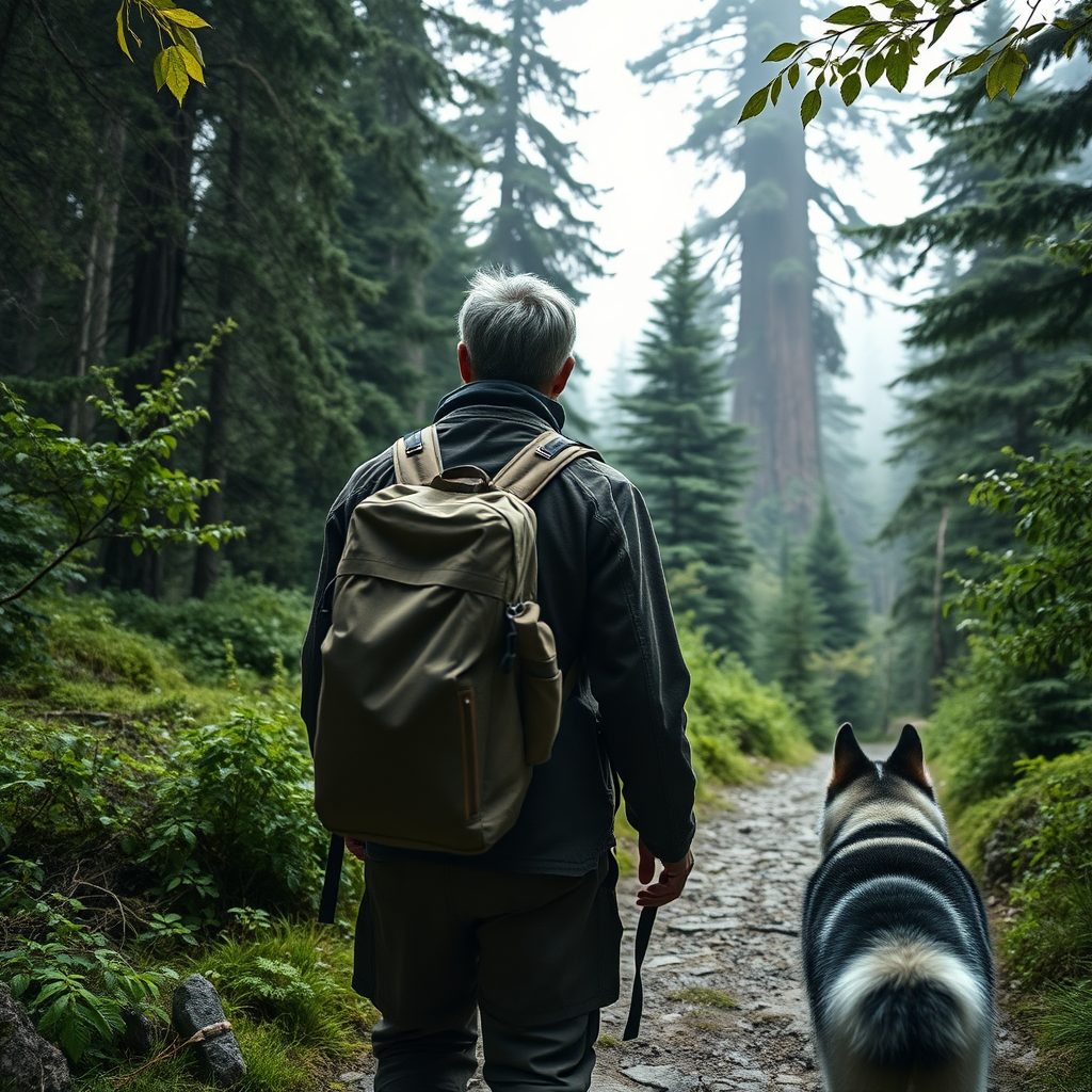 A breathtaking image captures a middle-aged man of average build with short, salt-and-pepper hair, accompanied by a Siberian husky. Walking along a rugged, natural path that winds into a magnificent Patagonian forest, the man is seen from behind, clad in rugged exploration gear. The lush greenery envelops the scene, with towering ancient trees visible in the distance. The diffused light of an overcast sky filters softly through the canopy, casting a serene yet adventurous mood. The husky is alert and engaged, its fur delicately illuminated by the ambient light. This scene embodies the untouched splendor of Patagonia—dramatic landscapes and the spirit of exploration. The textures of the man's clothing, the husky's fur, and the vibrant nature are hyper-detailed, captured with a cinematic composition and authentic color tones. A few leaves are caught in a gentle breeze, adding motion to the tranquility of the untouched wilderness.