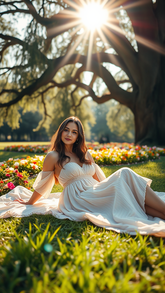 A breathtaking image captures a stunning woman in a flowing summer dress lounging on a soft blanket in a vibrant park. Her relaxed pose exudes grace as she sits beneath a majestic oak tree. The scene is brought to life with vibrant flowers in the background, enhanced by the morning sun casting gentle rays and subtle shadows across the frame. The photorealistic quality is achieved using the Sony A7III, offering ultra-high definition clarity. The natural lighting accentuates her serene expression and the rich colors of her dress, creating an inviting and tranquil atmosphere in the elongated park setting.