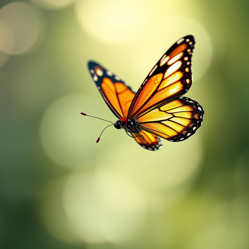 A breathtaking image of a butterfly caught mid-flight, capturing its grace and delicate movements in stunning detail. The scene is ultra-realistic, with vibrant colors and intricate patterns on the butterfly's wings beautifully rendered. The background is softly blurred, enhancing the sense of focus on the butterfly, while subtle sunlight filters through, casting gentle highlights. This highly detailed composition embodies the essence of nature's elegance and beauty, reminiscent of a National Geographic masterpiece, with an artistic touch that adds depth and emotion.