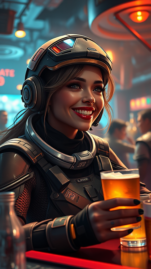 A breathtaking image of a female space warrior enjoying a drink in an extraterrestrial bar, exuding joy and slight intoxication, surrounded by a volumetric atmosphere with cinematic lighting that highlights her vibrant presence. Her exquisite face is rendered in digital art of the highest quality and resolution, capturing intricate details with flawless anti-aliasing. The scene is devoid of any distortions like low resolution, text errors, or anatomical inaccuracies, ensuring a seamless and immersive experience. There are no visual disruptions like JPEG artifacts or unwanted signatures, maintaining the purity of the artistic expression. The artwork is free from any defects or deformities, focusing entirely on the captivating narrative of a space soldier embracing leisure in a cosmic setting.