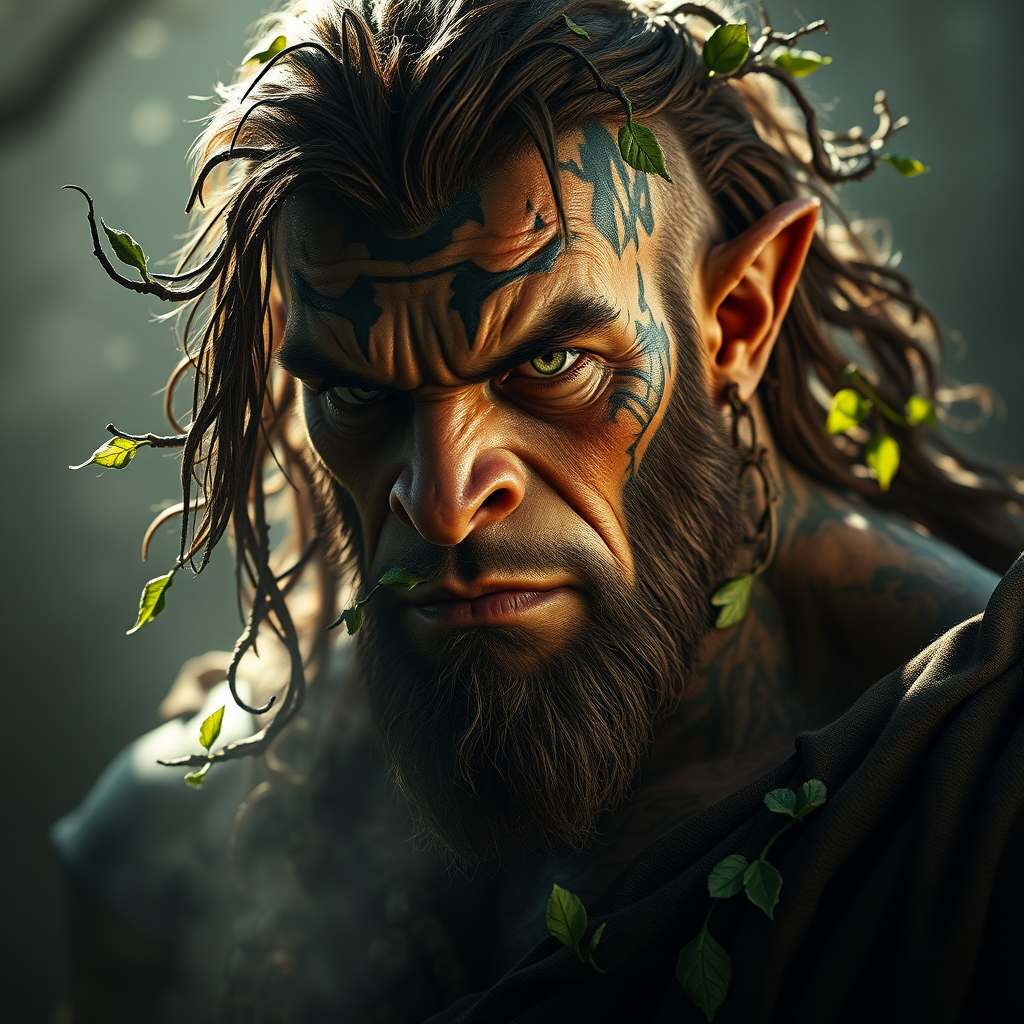A breathtaking image of an ultra-realistic male orc druid exudes a mystical presence, bathed in dramatic light that casts shadows across his rugged features. A light fog swirls around him, adding an ethereal atmosphere to the scene. His eyes, sharp and wise, peer intensely into the distance, surrounded by intricate tattoos that echo ancient lore. His muscular, verdant form is adorned with natural elements—vines and leaves entangled in his flowing mane of hair. The ultra-detailed textures of his weathered skin and the subtle play of light on his earthy robes are captured in stunning 4k quality, reminiscent of a masterpiece painted by John William Turner. The unreal engine 5 artistry brings the scene to life, embodying a timeless and otherworldly aura.