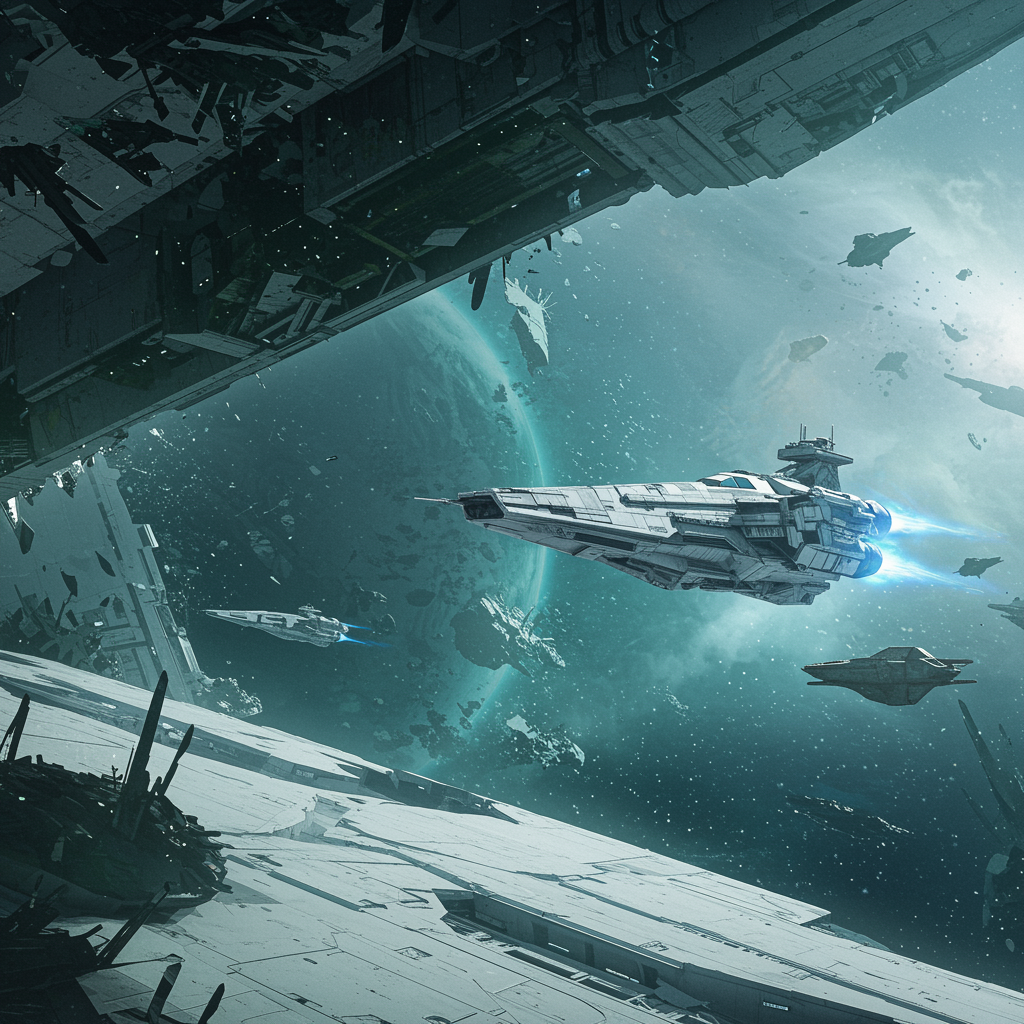 A breathtaking imax scene captures a spacecraft in action amidst a cosmic backdrop, reminiscent of star wars, in the distinctive style of an olympus af-1 cinematic still. The scene is painted in hues of light gray and blue, evoking a sense of wonderment and beauty. Fragmented planes of light gray and dark emerald converge with frostpunk elements, as a spaceship gracefully rides into view from a distance. The atmosphere is imbued with the creative flair of #vfxfriday and tinged with changelingcore charm. In a close-up view, the details are astonishingly clear, rendered in light indigo and white, culminating in a stunning 32k uhd visual. This digital art masterpiece seamlessly blends the awe of science fiction with the beauty of intricate design.
