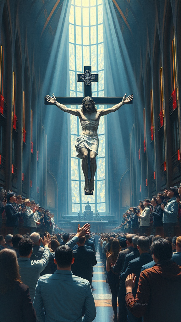 A breathtaking Impressionist oil painting depicting a cybernetic Christ suspended from a high-tech cross, embellished with sophisticated futuristic implants. This figure presides over a congregation of devoted worshippers, their hands raised in reverence, within the immense expanse of a futuristic techno cathedral. The setting invokes a sense of grandeur and ceremony, embodying a cyberpunk, sci-fi, neo-futuristic atmosphere. The scene is bathed in a dark ambiance, with dramatic beams of light pouring through tall stained glass windows, creating a cinematic and volumetric lighting effect. The painting captures an ultra-wide view with a deep depth of field, in the Impressionist style reminiscent of Claude Monet. This artwork poignantly symbolizes technology as the new faith for humanity, presenting figures in prayer before a techno Christ, all within a traditional Impressionist framework.