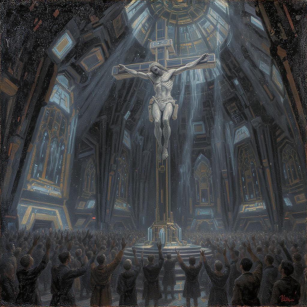 A breathtaking impressionist oil painting depicting a futuristic cyber Christ hanging from a techno cross, adorned with intricate cybernetic implants. He overlooks a congregation of devoted believers, who stand with hands raised in worship within a vast, cutting-edge techno cathedral. The atmosphere is imbued with a futuristic, ceremonial, and grandiose mood, blending cyberpunk, sci-fi, and neo-futuristic elements. The scene is bathed in a dark ambience, pierced by light rays streaming through towering stained glass windows. The dramatic, cinematic lighting enhances the ultra-wide composition, with depth of field adding to the immersive quality. Painted in the style of Claude Monet, this evocative work represents technology as the new faith, showing humanity worshipping at the altar of technology to a cybernetic Christ, all captured in a traditional impressionist style.