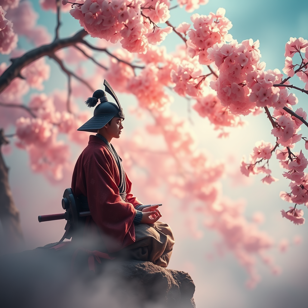 A breathtaking Japanese cherry blossom, enchanting and ethereal photo-realistic painting inspired by Tsukioka Yoshitoshi and Studio Ghibli, featuring a serene samurai in meditation. The scene is enveloped in volumetric mist, adhering to the rule of thirds composition, with intricate details highlighted by dramatic cinematic lighting. Captured in 4k resolution with a 50mm lens CGI, the image retains a 3D quality, reminiscent of delicate figurines. Rendered using Octane, it possesses an intentionally low-resolution charm, with subtle text elements and cropped composition, echoing the nostalgic appeal of jpeg artifacts.