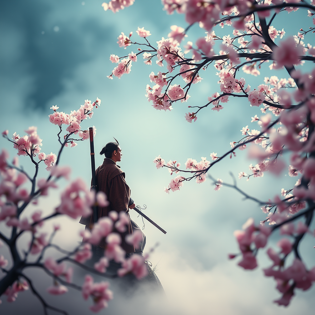 A breathtaking Japanese cherry blossom scene in a dreamy and ethereal photo-realistic painting style, influenced by Tsukioka Yoshitoshi and Studio Ghibli. The image depicts a samurai in meditation amidst delicate cherry blossoms, enveloped in volumetric fog. The composition adheres to the rule of thirds, showcasing highly detailed and dramatic cinematic lighting captured with a 50mm lens. The scene appears like a 3D dollhouse, rendered in octane, with intentionally low resolution to evoke a nostalgic quality, including minor jpeg artifacts and text elements, reminiscent of a weathered, timeless photograph.