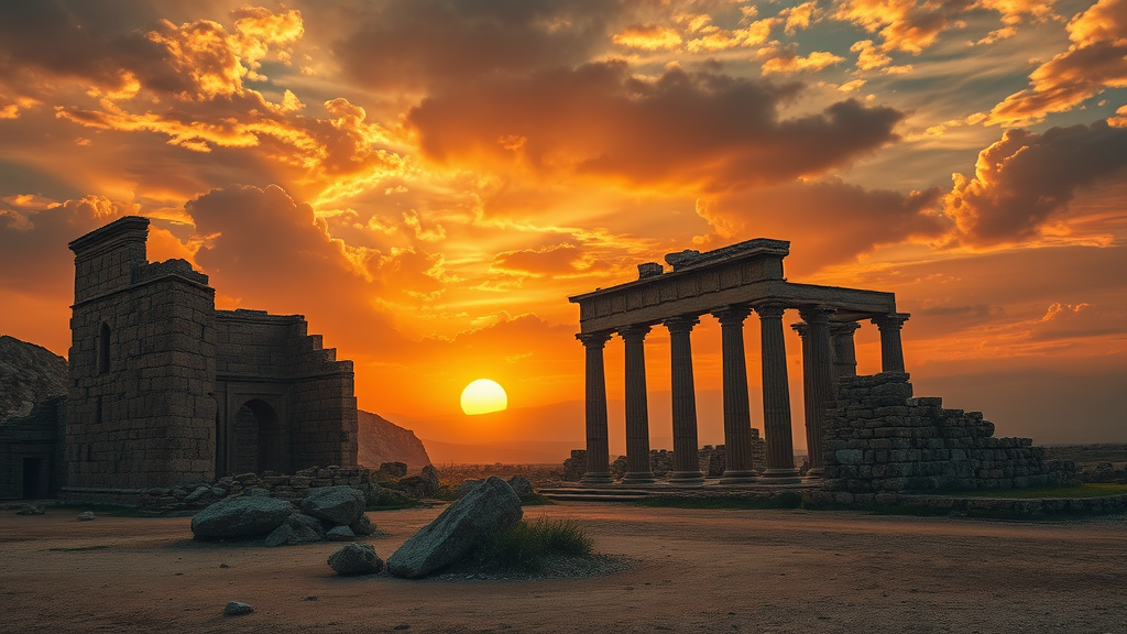 A breathtaking landscape of ancient ruins, set in a deserted expanse, illuminated by the warm hues of a setting sun. The sky is vast and epic, painted with dramatic clouds that cast an otherworldly glow. The scene is captured with cinematic precision, focusing on the intricate details of the weathered stone structures. The image is sharp and rich in texture, reminiscent of a studio photograph, capturing the essence of a forgotten world. Inspired by Greg Rutkowski, this scene is vividly detailed and evocative, with a timeless and artistic quality that is trending on art platforms.