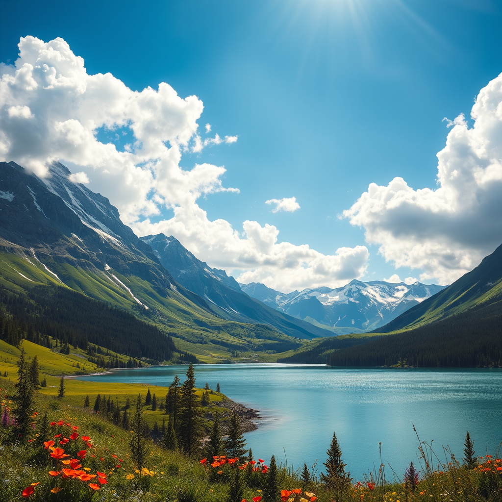 A breathtaking landscape unfolds before you, where towering mountains crowned with snow meet a serene, crystal-clear lake. The sky is a brilliant azure, dotted with fluffy white clouds casting playful shadows across rolling green hills. The vibrant colors of wildflowers pepper the scene, and a gentle breeze carries the fresh scent of pine through the air. Sunlight dances on the water, creating a shimmering surface that mirrors the beauty of the natural world around it.