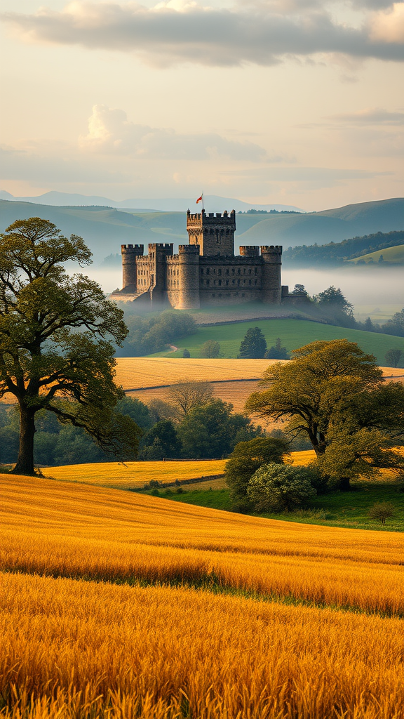 A breathtaking landscape unfolds with a medieval countryside where golden fields stretch towards an imposing English castle nestled on a distant hill, enveloped in a gentle morning mist. The scene is rich in atmospheric detail, captured in hyper-realistic clarity, revealing the intricate stonework of the castle's turrets against a backdrop of rolling, verdant hills. Majestic oak trees pepper the landscape, under a sky painted with soft morning hues. This 8k masterpiece offers an epic composition that exudes cinematic grandeur, reminiscent of an octane render. Drawing professional inspiration from Carr Clifton, the landscape captures the serenity and timelessness of nature, inviting viewers to immerse themselves in its tranquil beauty.