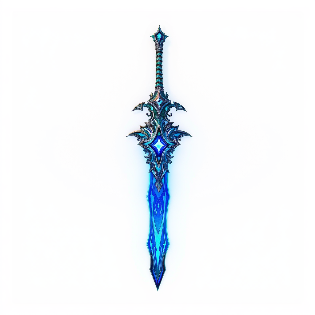 A breathtaking magic blade, ideal for a video game asset, set in a fantasy realm, featuring beautiful lighting and crafted in a detailed fantasy illustration style. The sword boasts an iridescent surface with intricate details, rendered with octane for maximum clarity and high sampling. It radiates a blue glow, displayed on a pristine white background, isolated to highlight its beauty, and trending on ArtStation. Imbued with an aura of mysticism, the sword captivates the viewer with its ethereal elegance and unmatched craftsmanship.