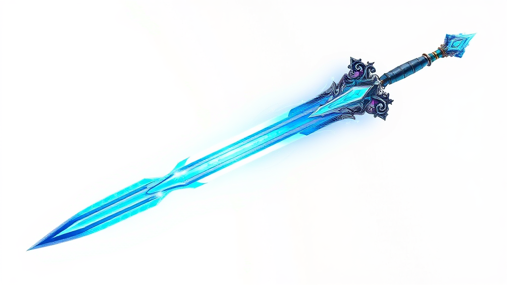 A breathtaking magical sword as a video game asset, set against a pristine white background. The sword features an intricate fantasy illustration style, with meticulous attention to detail. It glows with a mesmerizing blue light, exuding an iridescent shimmer that adds an ethereal quality. This sword is crafted with the highest level of detail, rendered with octane precision and high sample quality, making every facet of its design captivating. Perfectly isolated, it appears as if it's a relic from an ancient, enchanted realm. This artwork is trending on art platforms reminiscent of ArtStation, capturing the imagination with its blend of fantasy and realism.