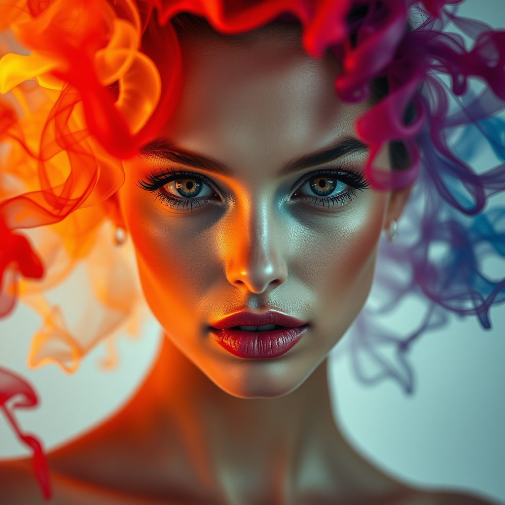 A breathtaking masterpiece, capturing the essence of supreme artistry, featuring a mesmerizing close-up of a stunning female supermodel, with deep, enchanting eyes and a face of flawless symmetry. The image radiates harmonious color blending, set in a surreal fantasy realm. The background is an explosion of vivid smoke fireworks, resembling ethereal ribbons of red, yellow, and blue transparent ink, all against a pure matte backdrop. This tableau invites the viewer into a world where fantasy meets elegance, and beauty is redefined in striking simplicity.