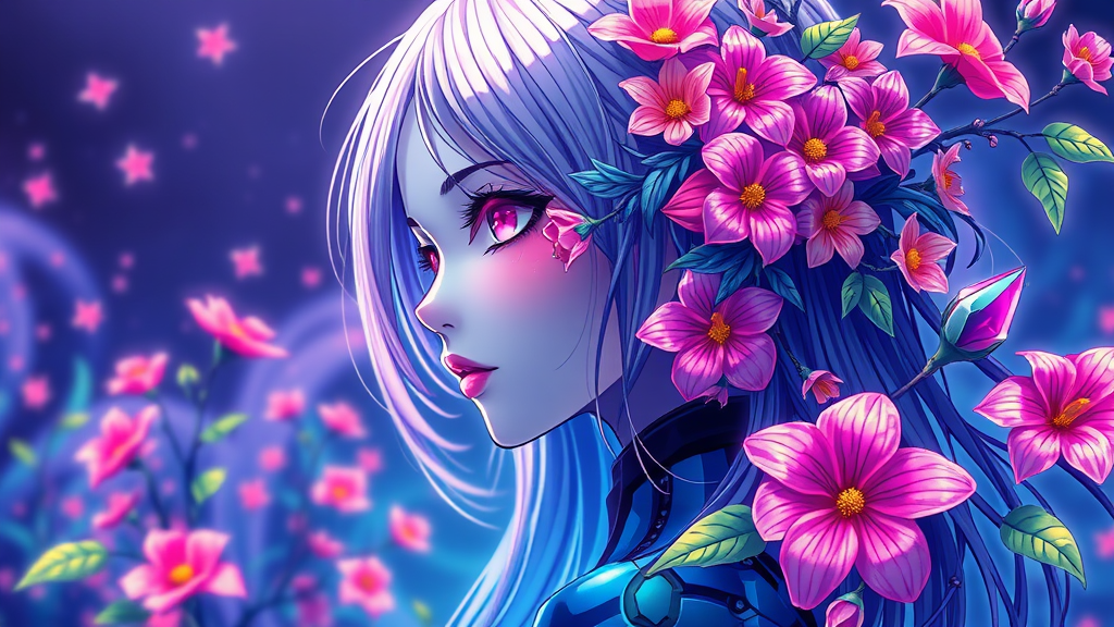A breathtaking masterpiece featuring a girl adorned with vibrant flowers intertwined in her hair, set in an anime style. This artwork, inspired by pixiv's renowned creations, blends elements of gothic art with a neon blacklight color scheme, showcasing multicolored, lustrous hues. The central figure, a stunning female android, stands out in a predominantly blue palette. The scene is enhanced with living flora, bringing an element of life to the picture. The art is finely antialiased, exhibiting a seamless, flowing design that maintains the integrity of colorful character design, with a touch of futuristic elegance.