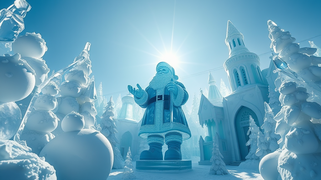 A breathtaking masterpiece in 8k, capturing a hyper-realistic world sculpted entirely from ice. Every element, from grand ice characters and towering ice buildings to delicate ice plants and trees, is crafted with stunning detail and clarity. At the heart of this frozen wonderland is a majestic, crystal-clear Santa Claus statue, meticulously carved and radiating a sense of awe. Sunlight filters through the transparent ice, creating a mesmerizing dance of light and color as it sparkles off the intricate ice formations, casting a magical glow over this enchanting scene. The atmosphere is one of serene beauty, the cool tones of the ice contrasting with the warm hues of the sunlight, bringing out the exquisite artistry of this icy paradise.
