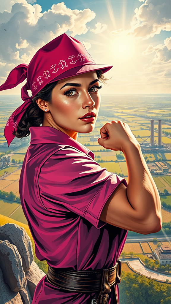 A breathtaking masterpiece in the style of Socialist Realism captures a woman exuding strength and determination, wearing a vibrant pink bandana and hat reminiscent of the energetic strokes of Alexander Deyneka's Soviet artistry. Her stance is powerful, embodying the vigor of the working class. The sunlight pours dramatically from the side, casting intricate shadows and enhancing the dynamic angles of her form. The background depicts an expansive vista of lush fields and industrial progress, symbolizing prosperity and unity. The scene is imbued with vivid colors, inspiring a sense of hope and collective effort, while intricate details in her clothing and the landscape draw the viewer deeper into this beautifully crafted narrative.