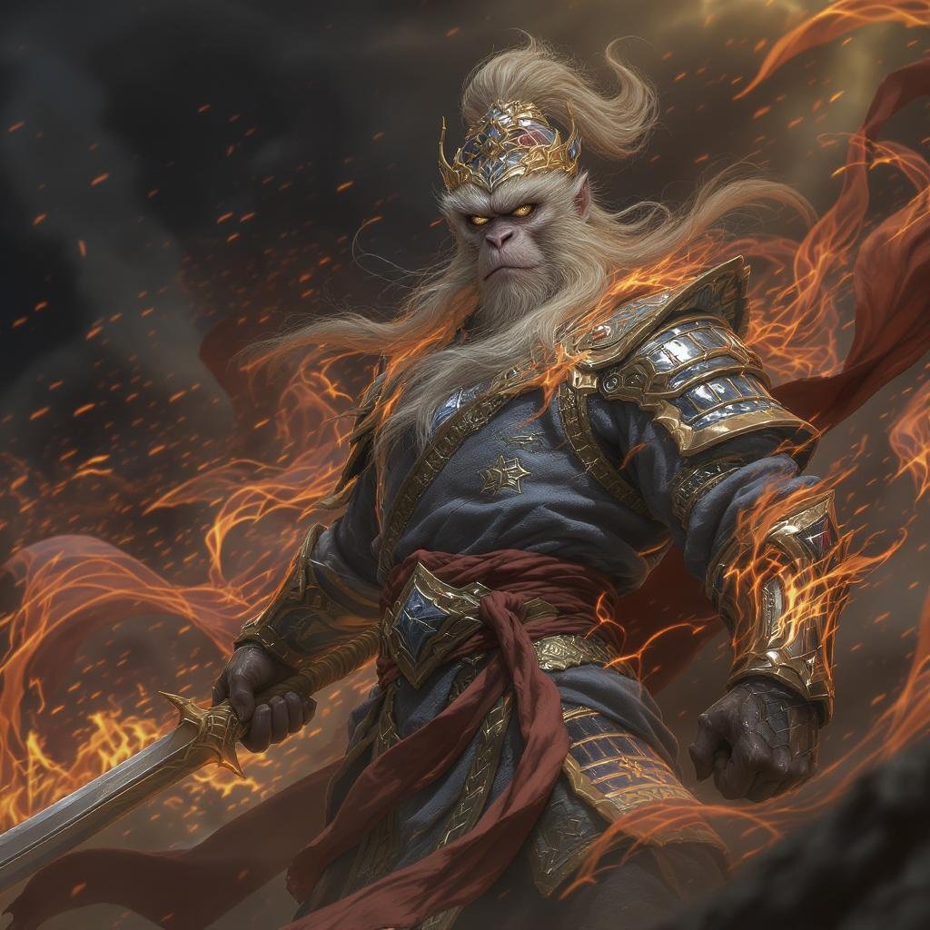 A breathtaking masterpiece of concept art featuring Sun Wukong, the Monkey King, in a dynamic mid shot. He strikes an imposing pose, centered, exuding majesty as fiery effects dance around him. His detailed eyes and shaded face add intensity to his expression. Clad in resplendent Chinese armor, blue robes, and intricate pauldrons, the depiction captures the essence of bravery and strength. Rendered with the precision of Unreal Engine, the art boasts 8k resolution and extraordinary detail. The use of depth of field and studio lighting enhances the composition, making it truly Award Winning and visually captivating.
