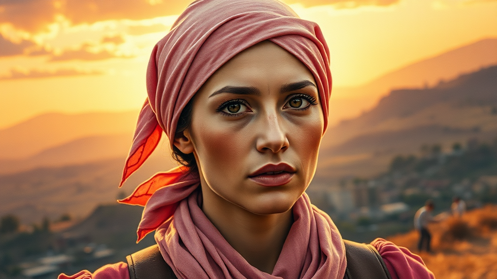 A breathtaking masterpiece of Socialist Realism, capturing the spirit of resilience and strength, featuring a woman adorned with a soft pink bandana and a matching hat. Her determined gaze is framed by dynamic angles and dramatic lighting that imbue the scene with life and movement. Inspired by the iconic style of Alexander Deyneka, the artwork showcases a vibrant landscape bustling with industrious activity in the background, symbolizing progress and community. The finely detailed textures and vivid colors highlight the fabric of her attire and the subtle emotions etched on her face, creating an image of both beauty and power, set against a dawn sky that bathes the scene in a warm, hopeful glow.