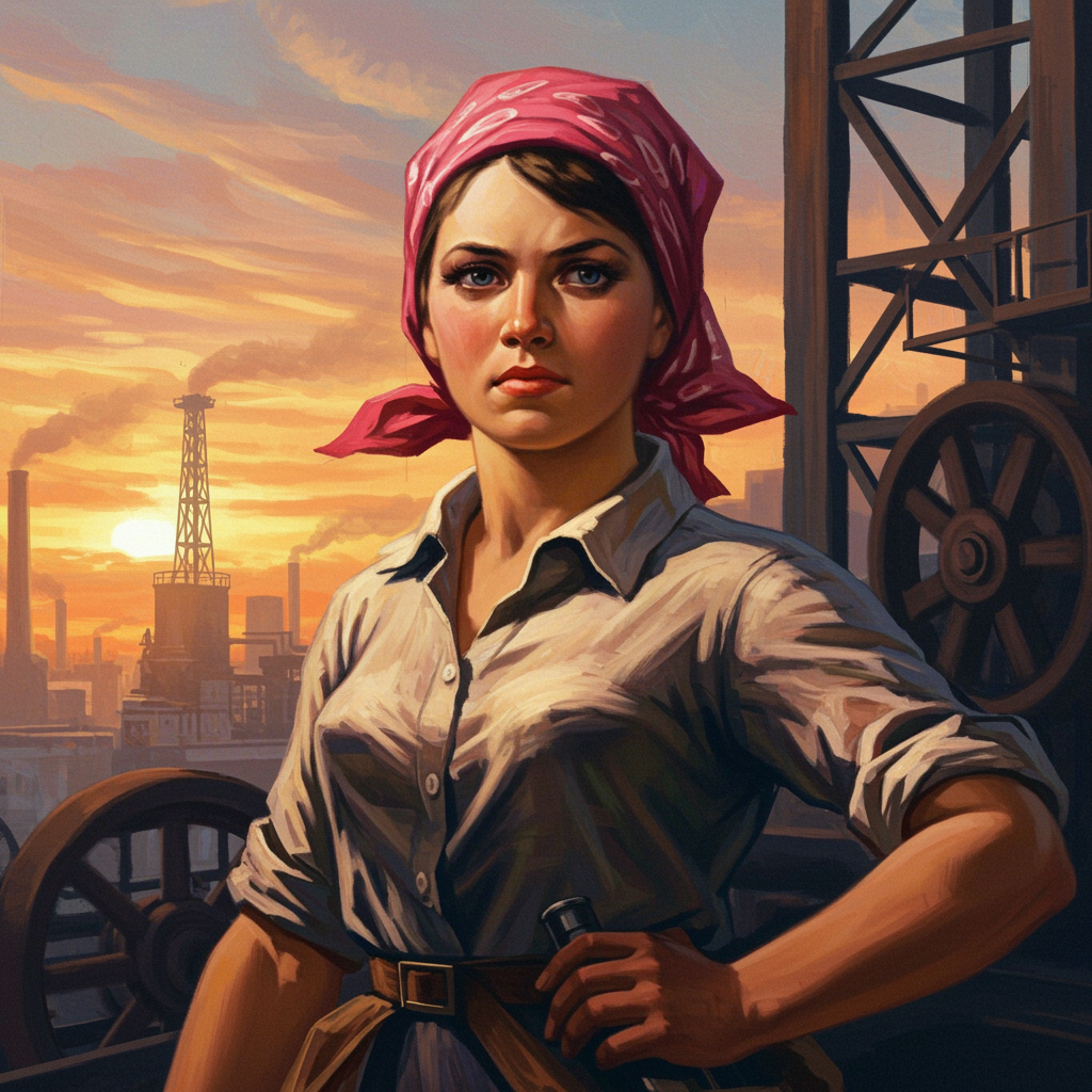 A breathtaking masterpiece of Socialist Realism, showcasing a woman wearing a vibrant pink bandana and hat, exuding strength and resilience. Her expression is one of determination and hope. The painting is deeply inspired by the iconic Soviet style of Alexander Deyneka, capturing the essence of the working class hero. She is surrounded by a dynamic industrial landscape, with gleaming steel structures and the subtle glow of machinery in motion. Bold and dramatic angles draw the viewer into the scene, where the play of light and shadow adds depth and vibrancy. The background is beautifully detailed, with hints of a sunrise casting warm hues across the sky, symbolizing a new dawn. Her attire blends traditional garb with a touch of modern flair, representing the bridge between past and future. The painting radiates with rich colors and fine textures, inviting the viewer to admire both its artistic elegance and its powerful message of progress and unity.