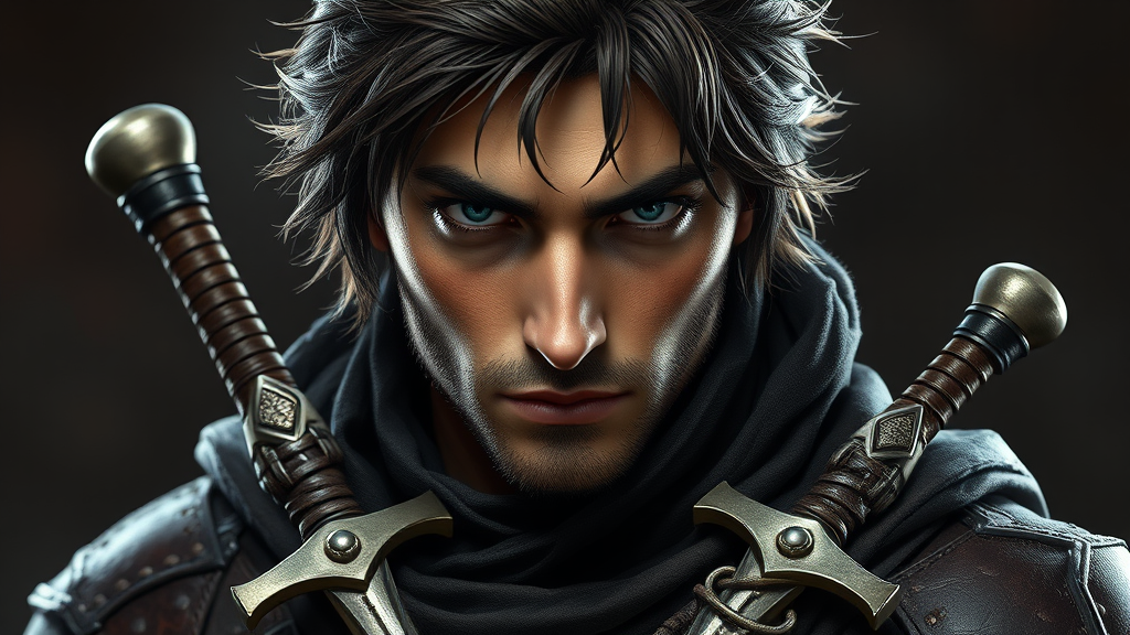 A breathtaking masterpiece portrait of a male rogue, capturing the essence of fantasy and adventure in an award-winning image. The full-body reference sheet showcases the intricate details of his attire, from the finely stitched leather armor to the glinting daggers sheathed at his side. Set in the immersive world of Dungeons and Dragons, the rogue's symmetrical features exude charm and mystery, with piercing eyes that hint at countless tales of stealth and cunning. Rendered in stunning 16k resolution, every texture and shadow is meticulously crafted to highlight the character's enigmatic presence, making it a true work of art in the realm of RPG fantasy.