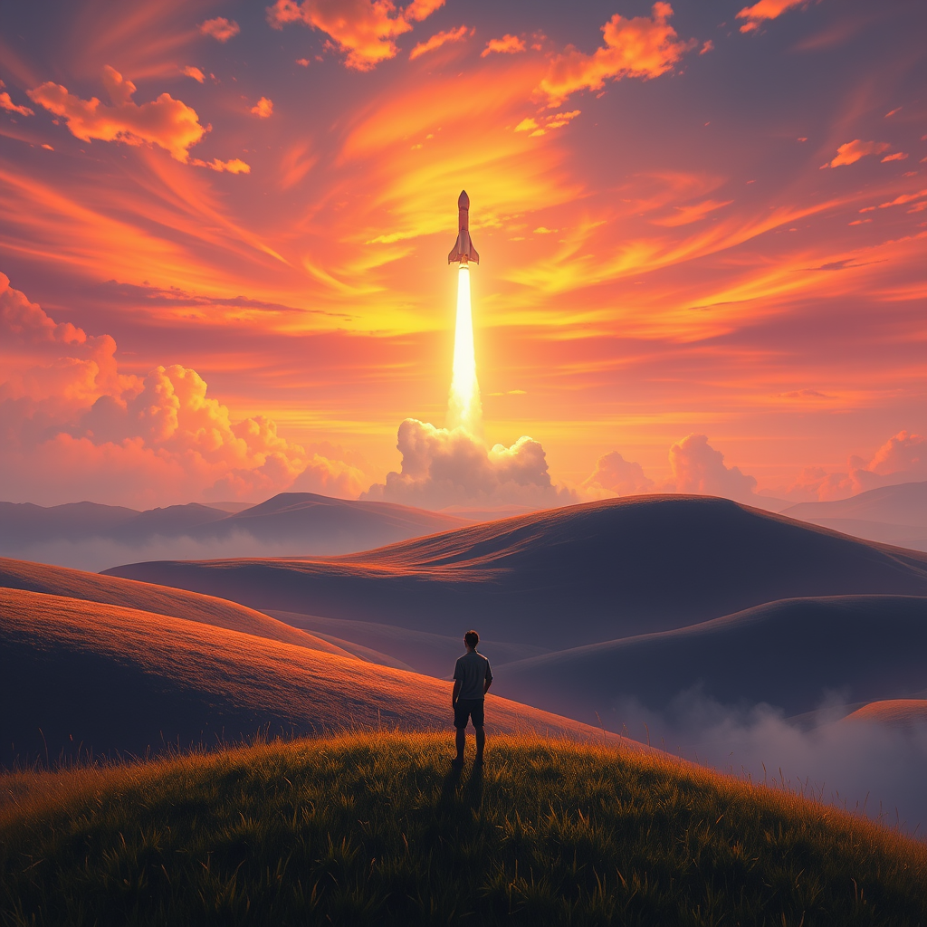 A breathtaking matte painting depicts a man standing on a lush hill, gazing at a majestic rocket launching into the sky in the distance. The serene landscape, reminiscent of Studio Ghibli and Makoto Shinkai’s work, features vibrant colors and dreamy, soft edges. The sky is a brilliant tapestry of oranges and purples, illuminated by the rocket's trailing flames. Volumetric lighting enhances the scene's ethereal quality, casting gentle shadows across the rolling hills. The man's silhouette is finely detailed, capturing a moment of awe and aspiration. The scene, rendered in high resolution, captures a sense of wonder and adventure, reflecting the influence of artists like Artgerm, WLOP, and Greg Rutkowski. This artistic masterpiece creates a feeling of tranquil anticipation, with every element harmoniously coming together to celebrate human ingenuity and the beauty of the natural world.