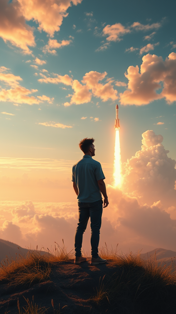 A breathtaking matte painting depicts a solitary man standing on a hill, captivated by the sight of a rocket launch in the distance. The scene embodies the enchanting style of Studio Ghibli and Makoto Shinkai, blended with the artistry of Artgerm, WLOP, and Greg Rutkowski. Volumetric lighting bathes the landscape in a heavenly glow, evoking a sense of wonder and tranquility. Rendered in stunning 4K resolution with the precision of an octane render, the image is a true masterpiece, showcasing intricate details that transport viewers to this serene moment. The man, gazing in awe, is perfectly proportioned and skillfully depicted, against a backdrop of vibrant skies and dynamic clouds. The harmonious composition exudes quality, inviting art lovers to explore every facet of this scene.