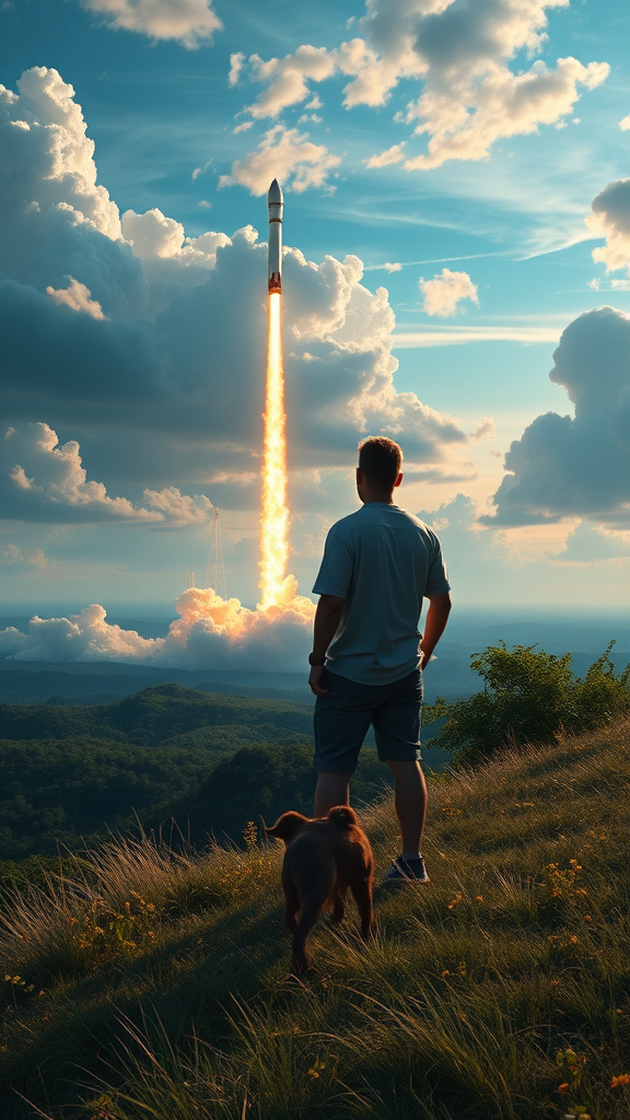 A breathtaking matte painting of a man standing on a grassy hill, gazing intently at a majestic rocket launch in the distance, drawing inspiration from Studio Ghibli, Makoto Shinkai, Artgerm, WLOP, and Greg Rutkowski. The scene is illuminated with enchanting volumetric lighting, rendered with Octane in stunning 4K resolution, reminiscent of trending masterpieces on ArtStation. The sky is painted with vibrant hues as the rocket ascends, leaving a trail of smoke that adds depth to the horizon. The viewer can sense the awe and wonder in the man's posture, the wind gently rustling his clothes, the lush foliage around him swaying in unison. The detail in the clouds and landscape speaks volumes of the artists' attention to the beauty of nature and the marvel of human achievement.