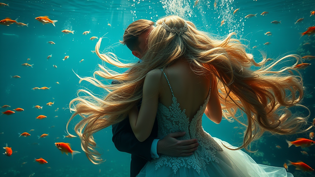 A breathtaking mermaid bride elegantly embraces her groom amidst a mesmerizing underwater scene filled with vibrant marine life, including a flurry of shimmering small goldfish. Her luxurious, flowing hair cascades with an ethereal grace as soft beams of light delicately pierce the water's surface, illuminating the enchanting underwater wedding ceremony. The atmosphere is cinematic and immersive, with intricate detail, ornate embellishments, and a refined elegance that captivates the senses. The setting is captured with an artful balance of 35mm, F/2.8, accented by a subtle vignette that enhances the intimate, dreamlike quality of the moment, rendered in stunning 4k resolution with dramatic lighting that accentuates the intricate beauty of the scene.
