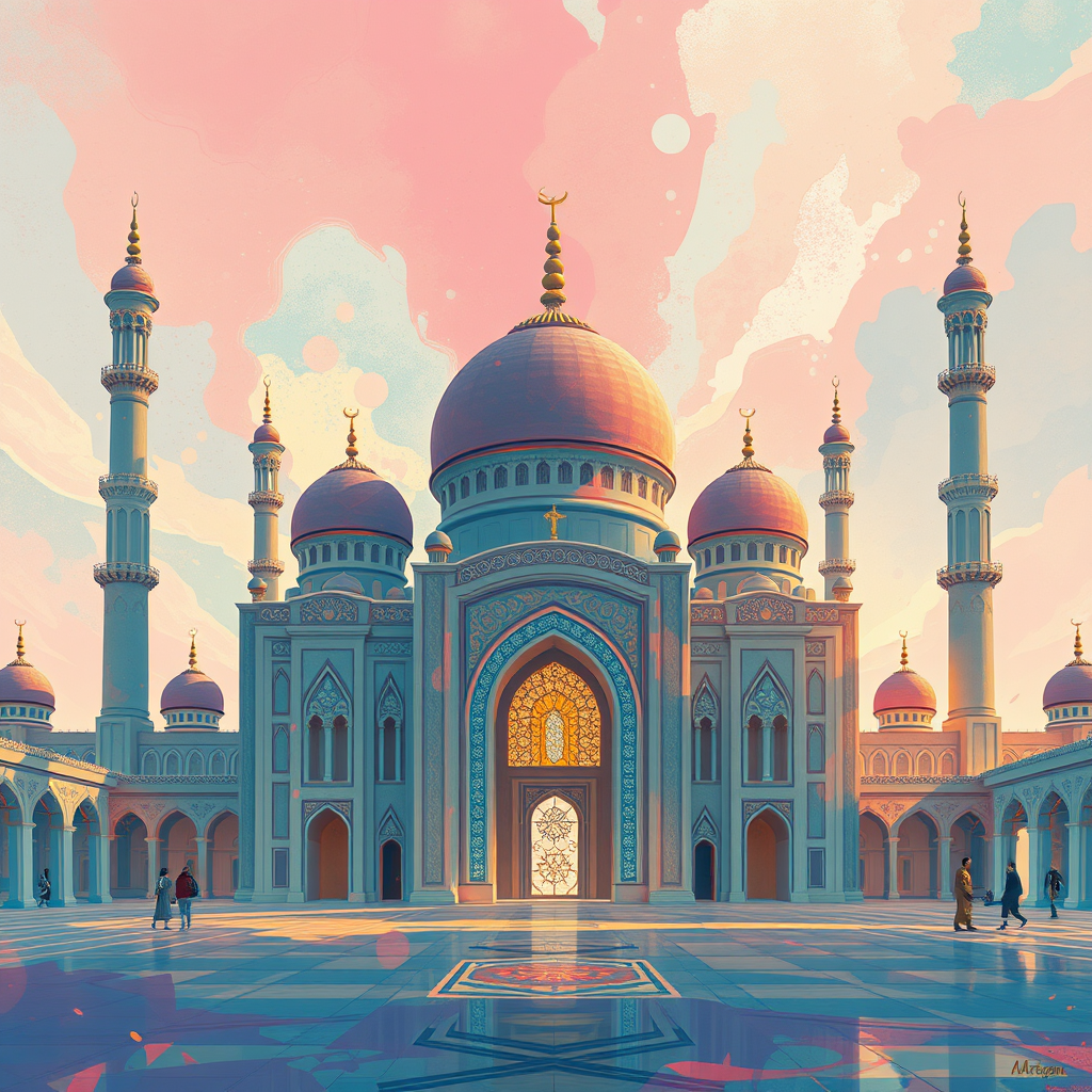 A breathtaking mosque, illustration by Lois van Baarle and Greg Rutkowski, influenced by Artgerm, vivid hues, abstract patterns, gentle contours, graceful arcs, pristine backdrop, high-definition, dreamlike, fantastical, geometric abstraction, vertical composition, personalized elements, subtle artistry, stylized elegance.