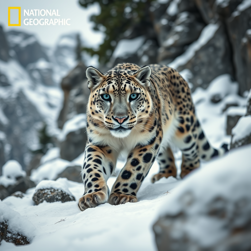 A breathtaking National Geographic-inspired wildlife photograph captures a magnificent snow leopard in a medium shot as it stalks through a snowy, craggy mountain forest on an overcast day, the rocks and trees blanketed in fresh snow. The full-body view reveals the snow leopard's sleek form, its intricately detailed fur standing out in high resolution. Its gaze is fixed intently on the viewer, exuding a predatory intensity. The hyper-detailed eyes shimmer, drawing focus, while the scene is rendered in crisp clarity and bathed in the soft, diffuse lighting of the natural environment. The photo conveys an awe-inspiring sense of the wild, maintaining the essence of a world-class wildlife portrait.