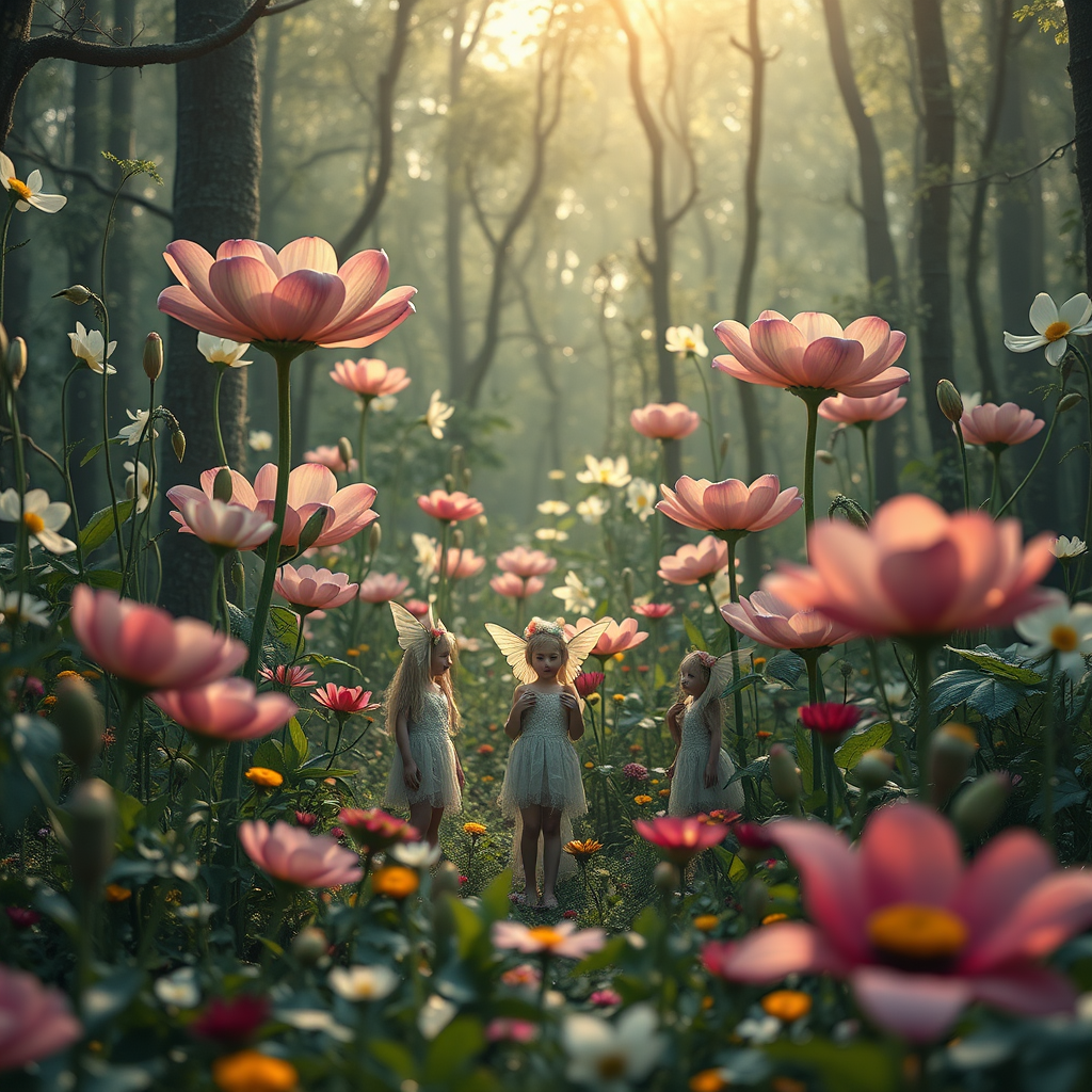 A breathtaking Oscar-worthy photograph capturing a cinematic scene of an enchanted forest filled with ethereal elves amidst a landscape of gigantic, whimsical flowers; the image showcases a brilliant blend of creativity and surrealism, evoking a sense of wonder and fantasy in a masterfully composed artistic shot, offering a unique and absurd yet stunning visual experience.