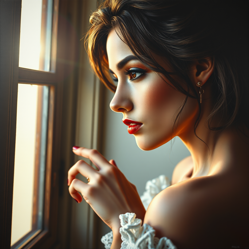 A breathtaking painting of a woman gazing thoughtfully near a sunlit window, in the style of enchanting femininity, with intricate details and a rich texture of heavy impasto, exuding an unbelievable allure, infused with a sense of romantic elegance, capturing a close-up perspective with a soft interplay of light and shadow, creating an aspect ratio of 7:13, a visual masterpiece with gentle stylization, version 6.