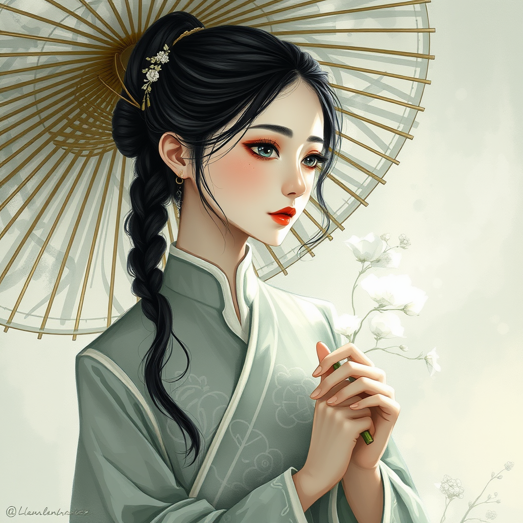 A breathtaking painting of a woman in a traditional Chinese dress holding a delicate bamboo umbrella, rendered in the romantic manga style. Her features are captured with ethereal transparency, and the palette blends dark white and light gray with gentle strokes of light green. The composition evokes a timeless beauty and romantic allure, showcasing feminine sensibilities in an enchanting landscape that feels both dreamlike and vivid.