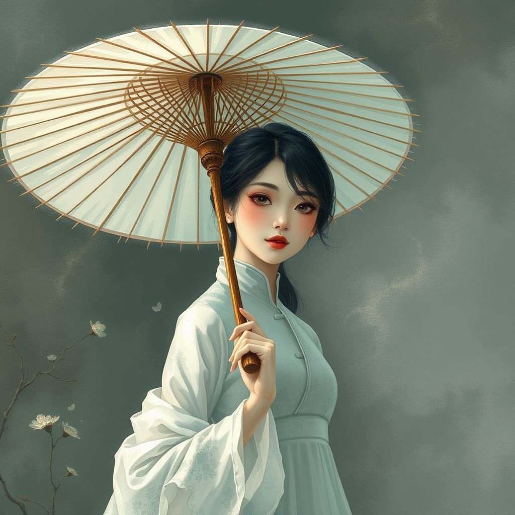 A breathtaking painting of a woman in traditional Chinese attire gracefully holding a bamboo umbrella, captured in the romantic manga style with ethereal transparency, blending dark white and subtle shades of soft gray. The scene evokes a sense of delicate beauty, reminiscent of romantic illustrations, enhanced by the gentle interplay of dark white and serene light green hues, capturing a harmonious blend of elegance and feminine sensibilities.