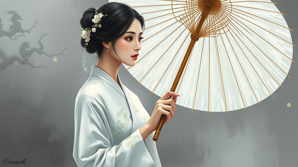 A breathtaking painting of a woman in traditional Chinese attire holding a delicate bamboo umbrella, portrayed in an ethereal romantic manga style. The scene captures her grace with soft transparency, blending dark white and gentle gray hues, while hints of light green add a whimsical touch. Her presence exudes an unbelievable beauty, reminiscent of enchanting romantic illustrations, expressing deep feminine sensibilities.
