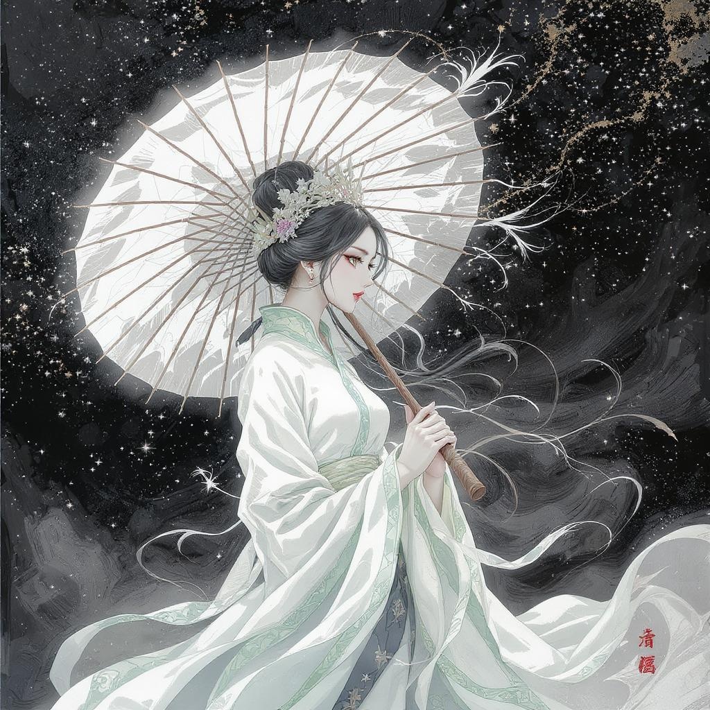A breathtaking painting of a woman in traditional Chinese attire holding a delicately crafted bamboo umbrella, her presence illuminated with an ethereal quality in the style of romantic manga. The composition features dark white, light gray, and light green hues that create an exquisite harmony, accentuating her radiant beauty. The romantic illustration captures her feminine sensibilities with soft, flowing lines and a dreamlike atmosphere, leaving viewers in awe of its artistic elegance.